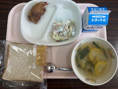 2023年7月18日 17時00分今日のメニューは、ライ麦パン、県産リンゴジャム、牛乳、ズッキーニのスープ、鶏肉レモンペッパー揚げ、しらすとアーモンドのサラダです(672kcal)。