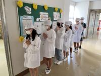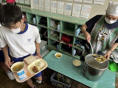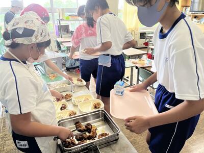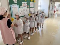 6年生の給食準備の様子です。1学期の給食も今日と明日のみとなりました。今日も感謝していただきます。