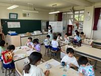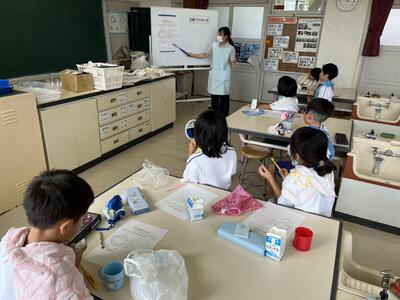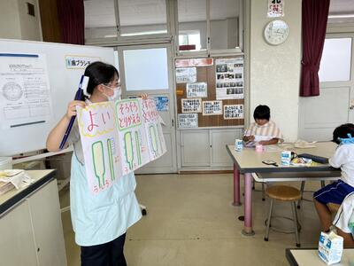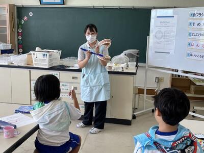 2023年8月28日 15時15分28日(月)のお昼休みは、1年生を対象としたブラッシング教室が行われました。養護教諭の指導による、歯の磨き方の染め出しチェックです。