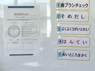 上手に歯みがきできたかな?・・・・・一人一人、先生に見てもらいながら、磨き残しの具合を確認してもらいました。