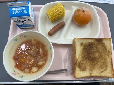 今日のメニューは、あまバターコーヒー食パン、牛乳、ミネストローネ、ウインナー、とうもろこし、冷凍ミカンです(686kcal)。