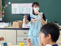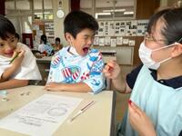 子どもたちは、給食後の歯磨きがきちんとできているかどうかを、カラーテスターを使って確認した後、教わったブラッシングでやさしく丁寧に細かいところを磨きました。
