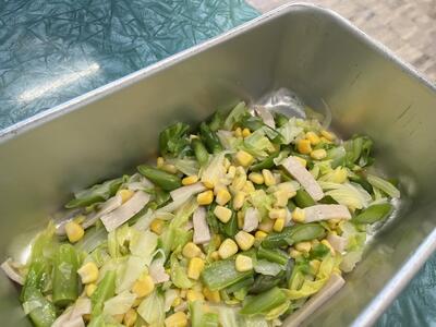 2023年5月12日 17時15分今日は、ごはん、牛乳、葉タマネギのみそしる、ぎんざけの西京焼き、野菜炒めです。(640kcal)