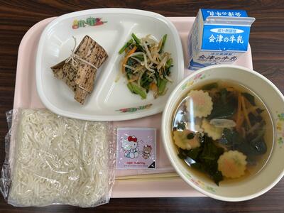 2023年5月11日 12時30分今日の給食値ニューは、とりなんばんめん、牛乳、ぶたにくちまき、くきたちともやしの三色おひたし、キティチーズです。(645kcal)