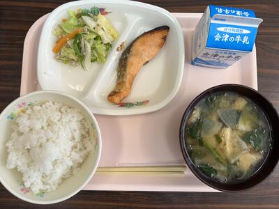 脂がのったおいしい銀鮭の西京焼きと季節の葉タマネギをつかったみぞしる、シンプルな塩こしょうで野菜のおいしさ感じる野菜炒めで、ご飯もすすむ給食でした。