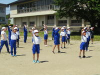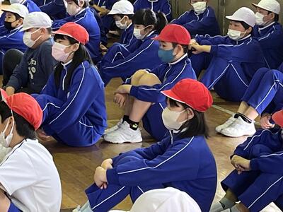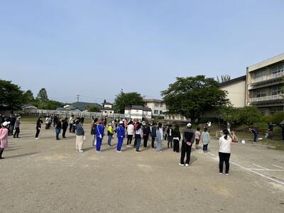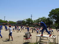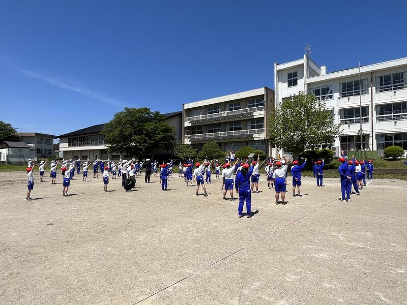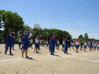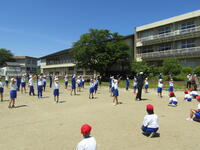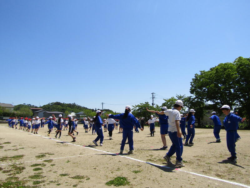 2023年5月12日 17時35分運動会の全体練習の第2回目を3校時に行いました。今日の内容は、「応援合戦」と「ダンス・ウォーミングアップ」です。