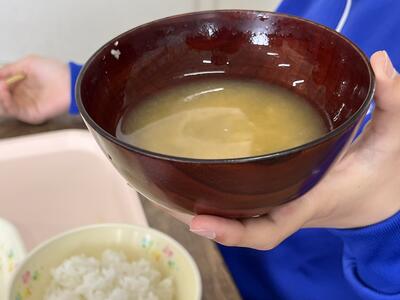 高級感があり軽くて手になじむお椀で、今日はけんちん汁をいただきました。写真は、6年生のお椀を持つ様子です。