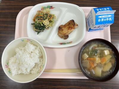 今日の献立は、ご飯、牛乳、けんちん汁、鶏肉の照り焼き、小松菜のごま和えです。(634kcal)野菜たっぷりのけんちん汁、ごまの風味と甘さがちょうどよいごま和え、子どもたちも喜ぶ照り焼きなどを、今日もおいしくいただきました。