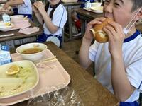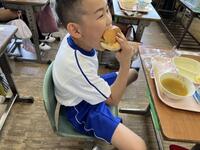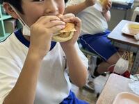 ボリューム感のある手作りのハンバーグや、薄塩味の千切りキャベツなどをはさんで、美味しく食べ応えのあるハンバーガーです。美味しそうにほおばる4年生の様子をお届けします。