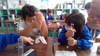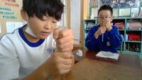 この日は、試験管の口に石けん水の膜をはって、試験管内の空気を温めたり冷やしたりしたときのせっけん水の膜の様子を観察し、気づいたことを話し合いました。