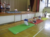 体育のマット運動で学習した前転、後転、飛び込み前転など、