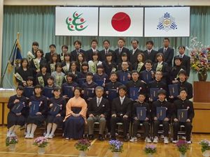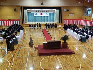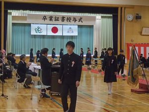 本日,山都中学校卒業証書授与式が多くのご来賓の方々のご臨席を賜り,厳粛にも温かな雰囲気の中行われました。「決意」「誇り」「感謝」が感じられる素晴らしい式となり,18名の卒業生が自分で選んだそれぞれの道に,力強い第一歩を踏み出しました。これまで陰に陽に,卒業生の成長を見守り支えていただいた多くの皆様に感謝申し上げます。 「輝け我らの山都中」「輝け我らの卒業生」