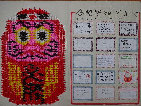 県立高校Ⅰ期選抜が明日に迫りました。職員室には3学期になって「ウカール」が置かれ,JR東日本の社員の皆さんからは実際に神社で祈祷していただいた「合格祈願絵馬」が届けられ,2階廊下にはしゃくなげ学級生徒が,折り鶴1000羽に願いを込めた力作「合格祈願ダルマ」が登場しました。多くの皆さんの支えと頑張っている自分への自信を力に,明日は伸び伸びと自分の力を発揮してほしいと思います。天気が心配です。雪への対策を忘れずに。