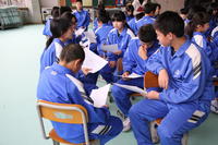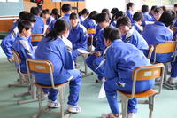 2019年11月21日 14時51分11月21日(木) 第5校時 本校では年に何回か全校生徒が一堂に会して道徳の授業を行っています。普段は授業で話し合う機会がない他学年の生徒とグループを作って話し合います。今回の授業では、スマホのLINEグループを介したトラブルが題材です。ある男の子が一人の女の子への悪口をやめようとメンバーに呼びかけると、正義感をひけらかしていると、逆に非難を受けて仲間はずれを受けるという内容です。子どもたちの間では起こりうる内容です。みんなの前では発表するのが苦手な生徒も、グループの中で話し合いに参加し、意見交換を行っていました。今回は3年生の先生方が授業の進行を担当してくれました。子どもたちが意見交換しやすいようにといろいろ工夫をしてくれたお陰で、子どもたちは他学年の生徒との話し合いを楽しみながら授業に取り組んでいました。