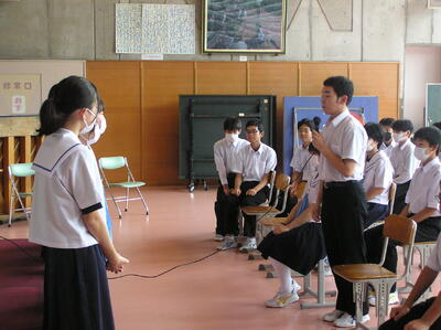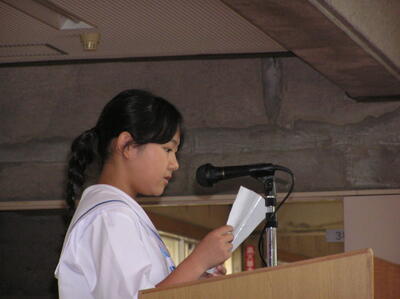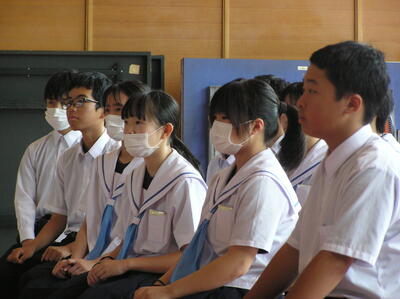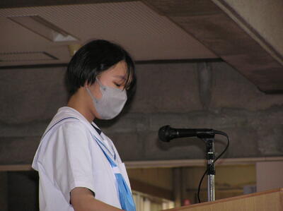 各学年の代表による「1学期の振り返りと夏休みへの決意」発表がありました。それぞれの発表に、真剣に耳を傾ける生徒たちの瞳がステキです。