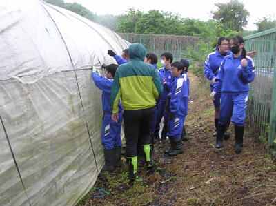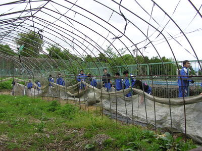 本校では、1年総合的な学習の時間の取り組みで、小学校での農業学習と、SDGs・技術・家庭科(栽培)を関連させて、無灌水栽培の学習に取り組んでいます。チャルジュウ西会津農場より、小川様を講師にお招きし、今年度の栽培学習が始まりました。1回目の今日の活動は、ハウスの屋根かけと温床作りです。1年生たちは、慣れない作業に戸惑いながらも、一生懸命に作業していました。